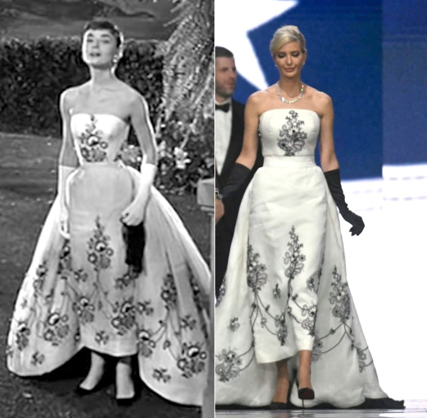 이 드레스는 명품 브랜드 지방시에서 이방카를 위해 맞춤 제작한 것이다. 영화 ‘사브리나’ 속 헵번 의상은 지방시가 디자인한 것으로 유명하다.