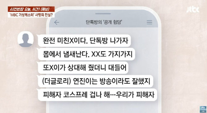 지난 달 31일 방송된 JTBC 시사·교양 ‘사건반장’에 따르면, 이 대화방에는 고인의 MBC 기상캐스터 선배 4명이 들어가 있다.