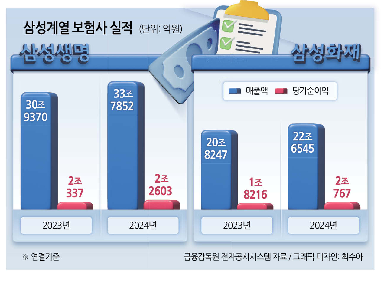 생명보험회사와 손해보험회사 각각 업계 1위인 삼성생명과 삼성화재가 지난해 나란히 호실적을 기록하면서 역대 최대 실적을 거뒀다. 특히 삼성화재는 손해보험 업계를 통틀어 처음으로 연간 순이익 2조원을 돌파했다.