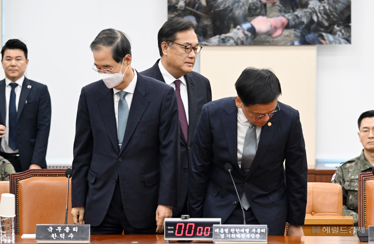 [헤럴드pic] 자리에 앉는 최상목 대통령 권한대행 글꼴 선택 본문 텍스트 크게본문 텍스트 작게 인쇄 [헤럴드경제=이상섭 기자] 최상목 대통령 권한대행 부총리 겸 기획재정부 장관(오른쪽)이 6일 서울 여의도 국회에서 열린 ‘윤석열 정부의 비상계엄 선포를 통한 내란 혐의 진상규명 국정조사 특별위원회’ 청문회에서 증인으로 참석해 한덕수 국무총리(왼쪽)와 정진석 대통령 비서실장과 인사 후 자리에 앉고 있다.