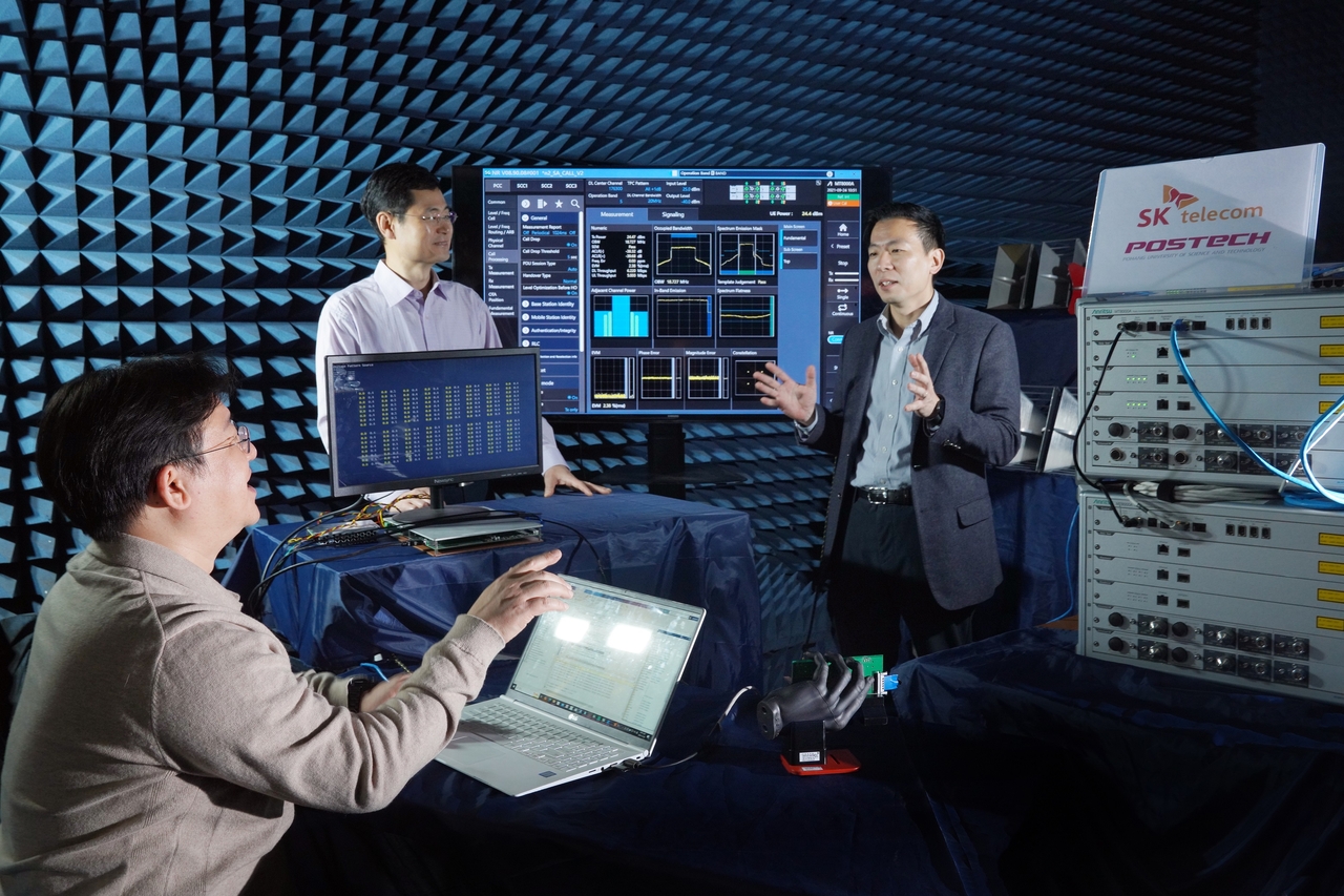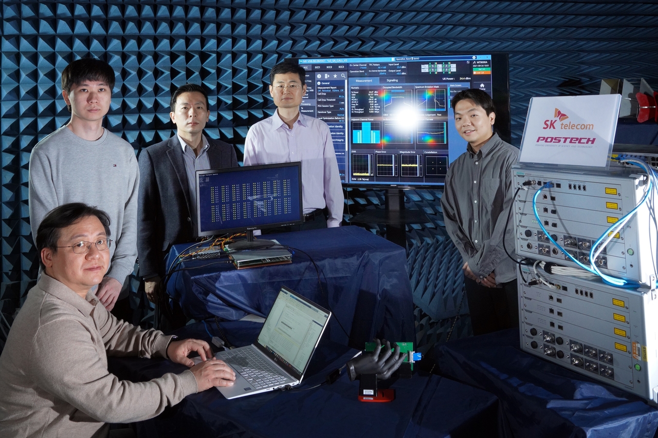 | SK텔레콤 연구원과 홍원빈 포스텍 전자전기공학과 교수팀이 포스텍 연구실에서 해당 기술을 시험하는 모습. [SK텔레콤 제공] |
