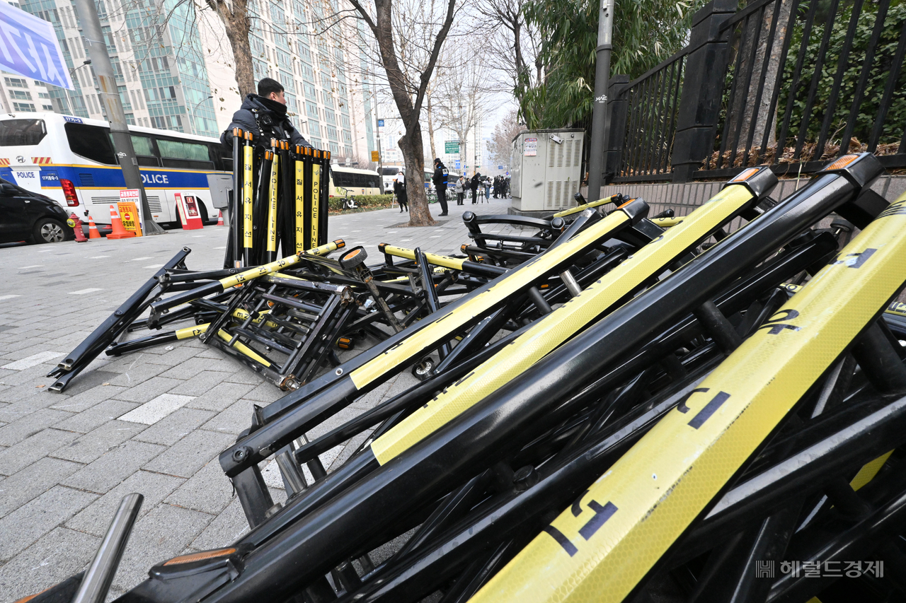 | 서울서부지방법원이 지난 19일 새벽 윤석열 대통령에 대한 구속영장을 발부한 것에 반발해 윤 대통령 지지자들이 법원 청사로 난입해 폭동을 일으키는 초유의 사태가 발생했다. 20일 오전 서울 마포구 서울서부지방법원 정문에 철책이 폭동으로 인해 파손되어 있다. 임세준 기자 |