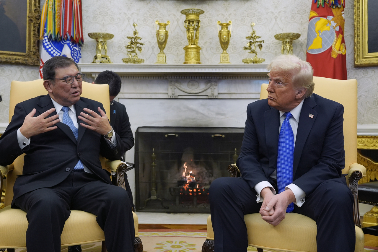 도널드 트럼프 미국 대통령과 이시바 시게루 일본 총리가 7일(현지시간) 워싱턴D.C. 백악관 오벌 오피스에서 대화를 나누고 있다. [AP}