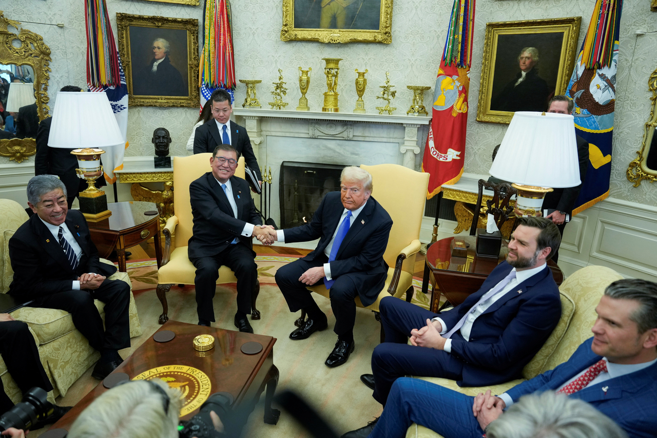이시바 총리가 백악관에 도착하자 트럼프 대통령이 현관까지 나와 반갑게 맞았으며, 두 사람은 악수를 나눈 뒤 취재진에 손을 흔들기도 했다. 트럼프 대통령은 이 때 “우리는 일본을 사랑합니다”라고 말했다.