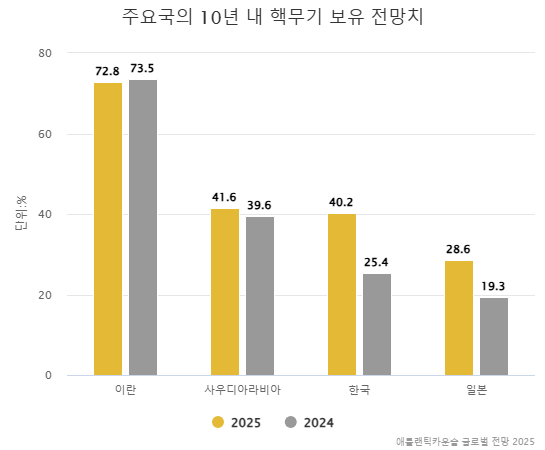 13일 미국 외교·안보 싱크탱크 애틀랜틱카운슬이 내놓은 ‘글로벌 전망 2025’에 따르면 설문에 응한 356명의 세계 안보 전문가 가운데 40.2%가 한국이 10년 내 핵무기를 보유할 것으로 답변(복수응답)했다. 작년 조사에선 25.4%였다. 주요 핵무기 미보유국 가운데 상승률 1위다.
