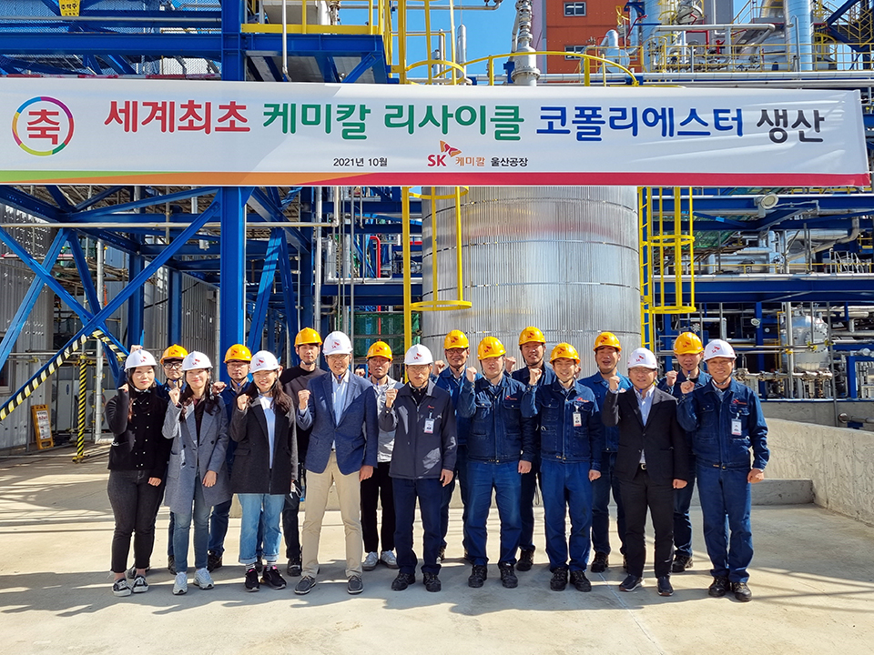 | 2021년 SK케미칼 울산 공장에서 진행된 화학적 재활용 기술을 적용한 코폴리에스터 양산 성공 행사 모습 |