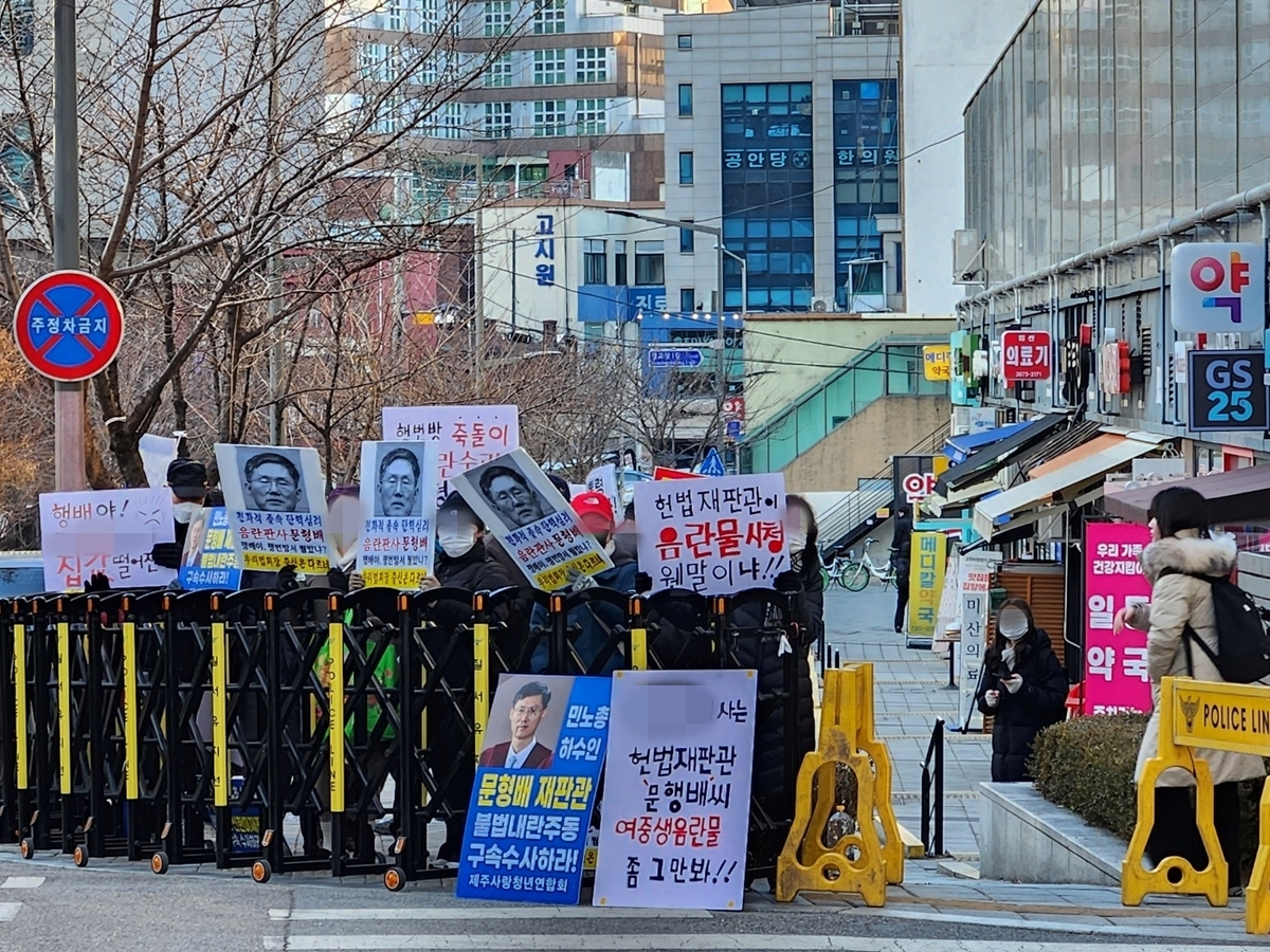 탄핵 심판이 막바지에 이르면서 ‘헌재 흔들기’가 심각한 상황이다. 일부 윤 대통령 지지자들은 문 권한대행의 자택 인근으로 찾아가 시위를 벌이고 다른 헌법재판관들의 주거지 확보를 시도하고 있다. 또 지난해 헌재 공보관을 역임한 이진 헌법연구관이 ‘중국 국적’이라는 가짜뉴스도 퍼뜨리고 있다. 헌재 홈페이지 게시판에 이런 비방글이 수백개 게시되기도 했다.