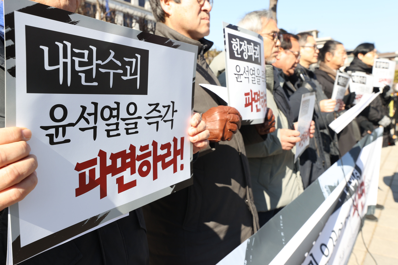 | 시민사회단체연대회의가 21일 서울 종로구 헌법재판소 앞에서 ‘윤석열 파면 촉구 기자회견’을 하고 있다. <연합뉴스> |
