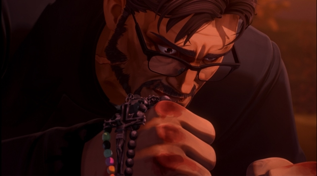 곧이은 장면은 주인공이자 선역 퇴마사 박 베드로 신부의 등장이다. 박 신부는 원작 소설에서 ‘덩치가 크다’고 묘사되어 있는데 애니메이션에서도 서양 UFC(종합격투기) 선수마냥 떡 벌어진 어깨의 다부진 체격으로 그려냈다. 이적(구마)을 행한다는 이유로 파문된 박 신부는 십자가만 있다면 고대 악령과도 싸워낼 수 있는 힘을 지녔다. 수없이 많은 오컬트 장르에서 카톨릭 신부가 보여주는 박애주의 정신을 장착한, 정의롭지만 단조로운 인물이다. 그의 트라우마는 악령에 씌인 소녀를 구하지 못했다는 자책감에서 나오는데, 근 10년간 ‘검은사제들’을 비롯해 너무나 비슷한 설정을 많이 접한 관객들에게는 식상함을 줄 수도 있다.
