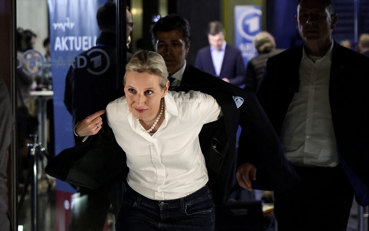 | 알리스 바이델 독일대안당(AfD) 공동대표가 23일(현지시간) 베를린에서 TV 토크쇼에 출연한 뒤 방송국을 나서고 있다. [EPA] |