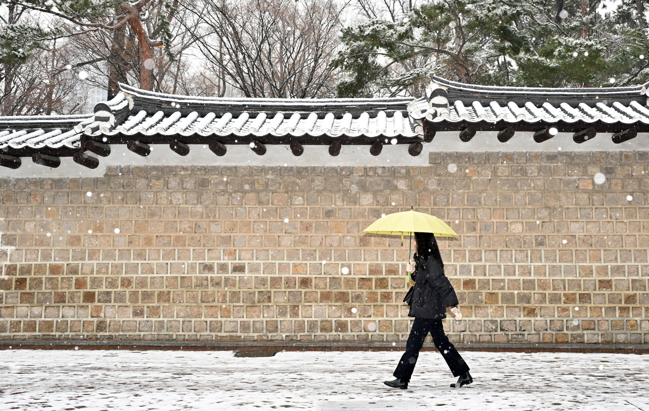 | 12일 오전 서울 중구 덕수궁 돌담길에서 한 시민이 지나가고 있다. 임세준 기자 |