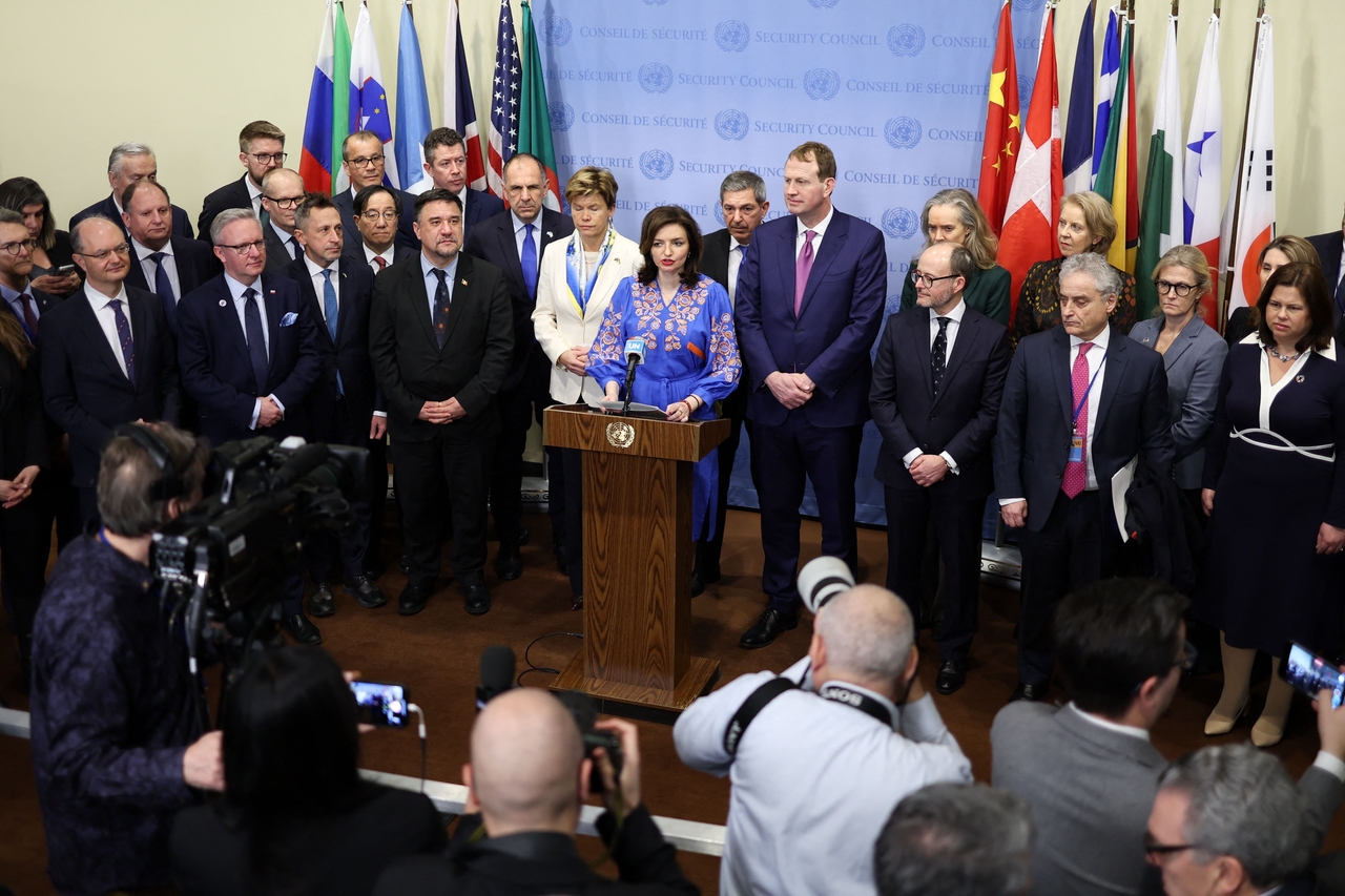 | 마리아나 벳사 우크라이나 외교차관이 우크라이나 전쟁 3년을 맞은 24일(현지시간) 미국 뉴욕 유엔본부에서 러시아의 침략을 규탄하는 기자회견에 다른 국가 대표단과 함께 참석하고 있다. [AFP] |