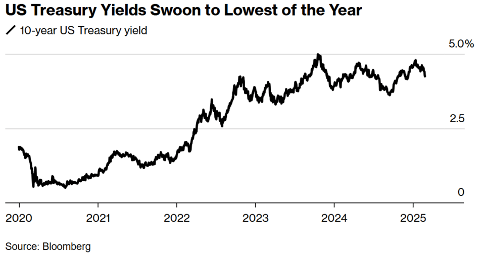 시장 전문가들은 “트럼프 대통령의 정책이 실질적인 경제적 피해를 초래할 수 있다는 분위기로 바뀌고 있다”고 진단했다. 마크 커드모어 블룸버그 마켓라이브(MLIV) 총괄 편집자는 “월요일(24일)을 기점으로 ‘미국의 새 행정부가 아직 친성장 기대감을 전달하지 못하고 있다’는 기조에서 ‘미국 정책이 실질적인 경제적 피해를 초래할 수 있다’로 바뀌었다”고 분석했다. 그는 “미국 10년물 수익률은 두 달여 만에 최저 수준”이라며 “앞으로 몇 주 동안 다시 한 번 하락할 가능성이 높다”고 전망했다.