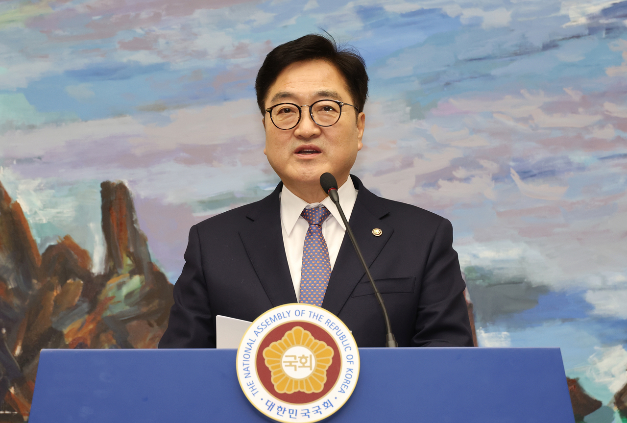 | 우원식 국회의장이 27일 국회에서 현안관련 기자회견을 하고 있다. [연합] |