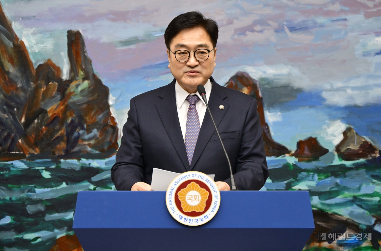 [헤럴드pic] 기자회견하는 우원식 국회의장 글꼴 선택 본문 텍스트 크게본문 텍스트 작게 인쇄 [헤럴드경제=이상섭 기자] 우원식 국회의장이 27일 오후 서울 여의도 국회 의장접견실에서 마은혁 헌법재판관 미임명에 대한 기자회견을 하고 있다.