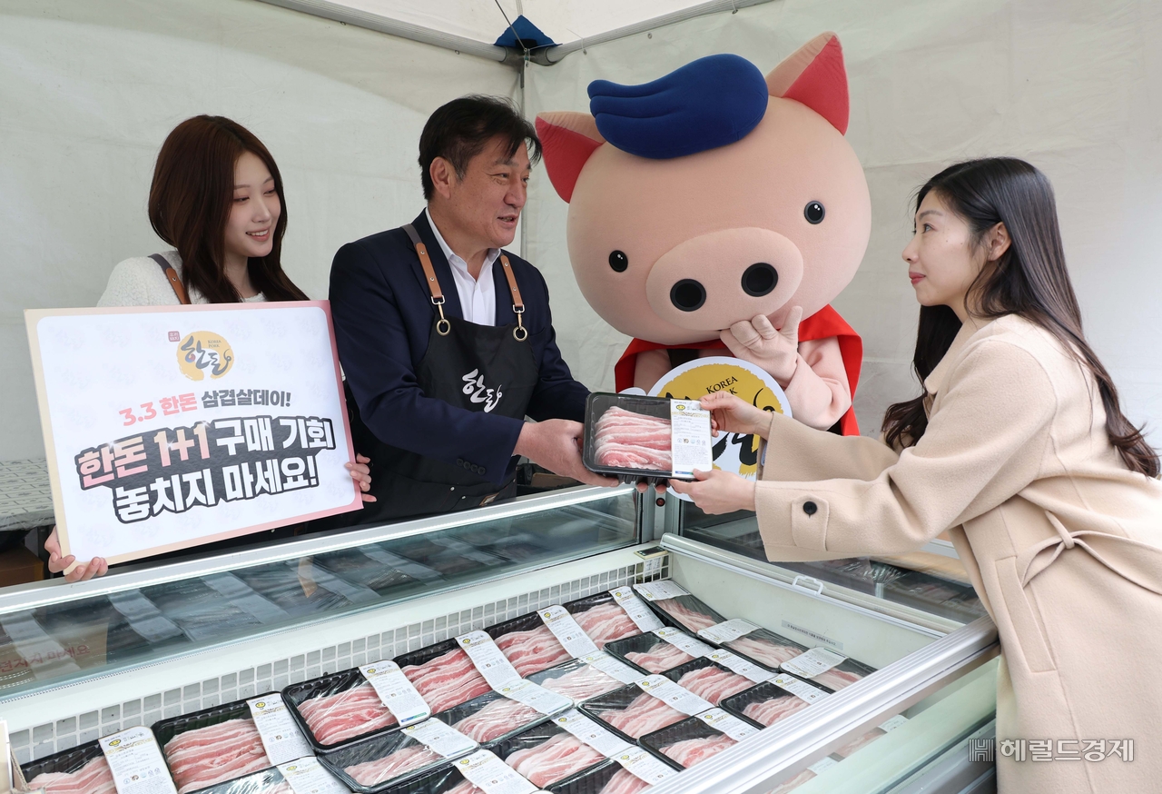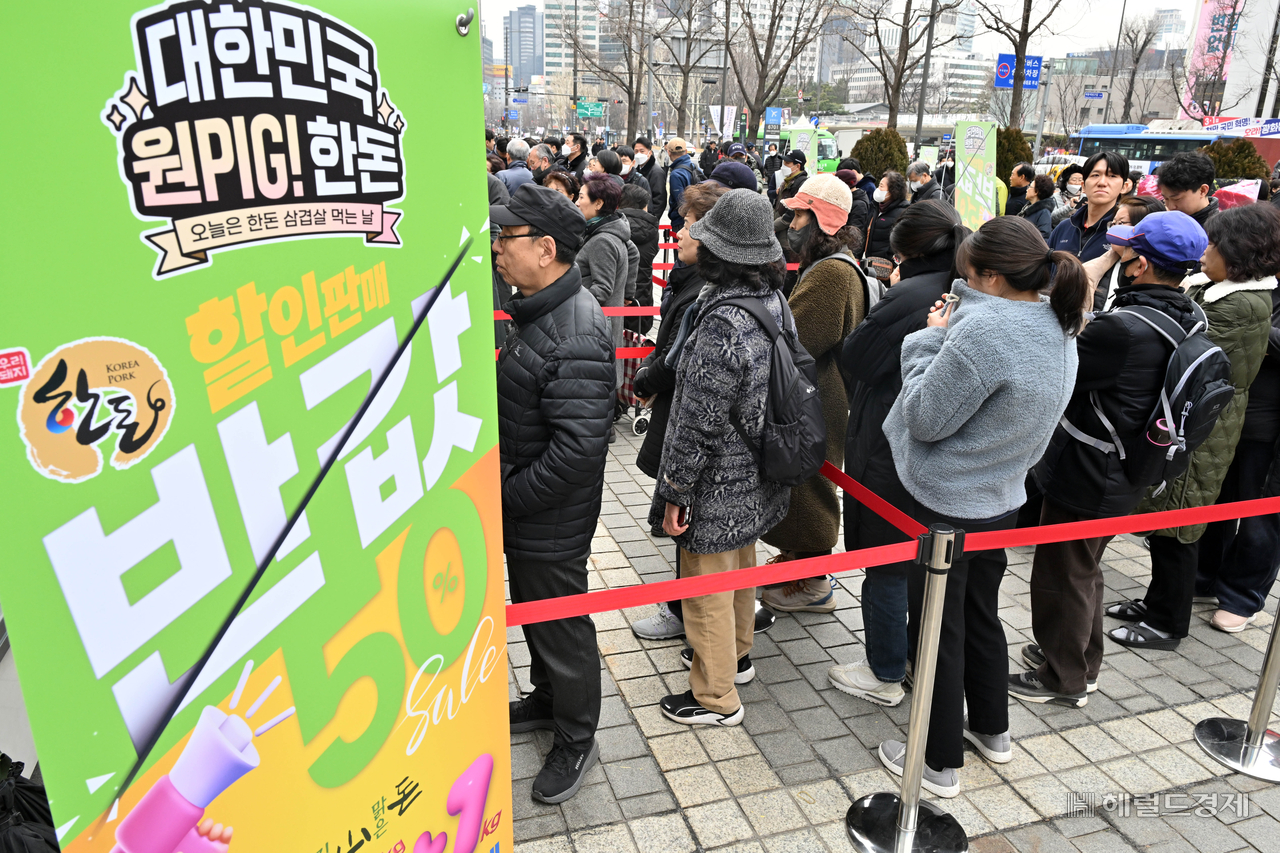 [헤럴드경제=임세준 기자] 28일 오전 서울 중구 프레스센터 앞 마당에서 열린 2025 삼겹살데이 현장 특판 ‘대한민국 원PIG! 한돈’행사장을 찾은 시민들이 국산 돼지고기를 구매하고 있다.