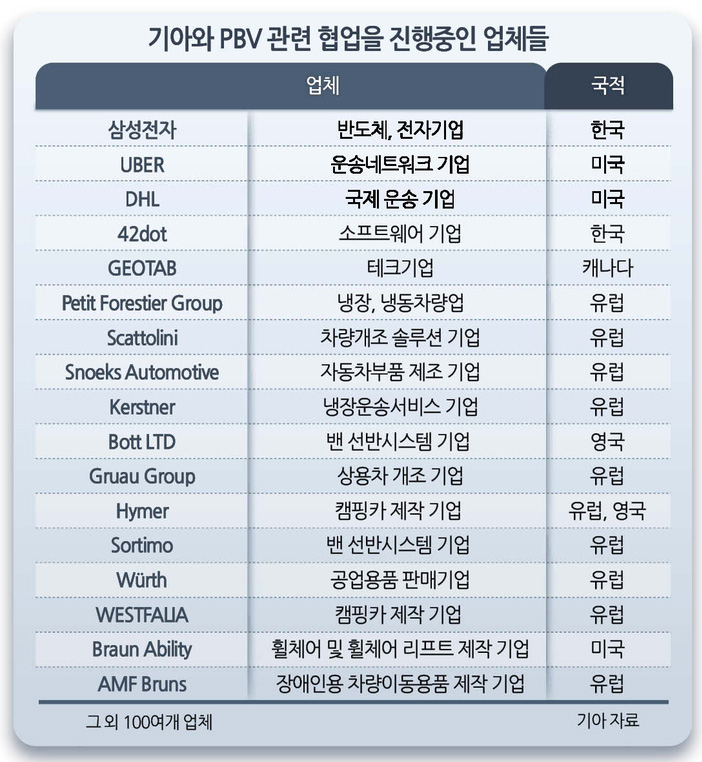 기아는 PBV 사업 확장을 위한 파트너 모집에도 매진하고 있다. 이날 ‘2025 EV데이’에 기아는 파트너 관계를 맺고 있는 100여개의 사업파트너 중 17개의 주요 업체들을 공개했다.