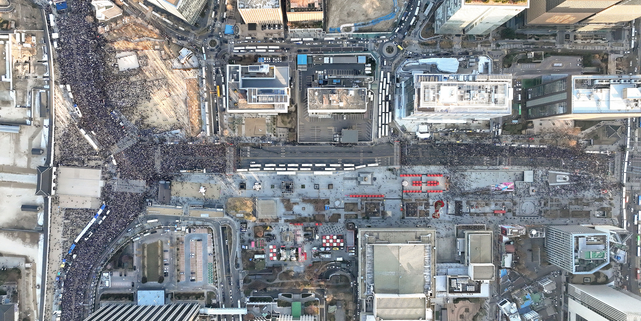 | 지난해 12월 28일 오후 서울 광화문광장 일대에서 윤석열즉각퇴진·사회대개혁 비상행동 주최 대통령 퇴진 집회(왼쪽)와 대한민국바로세우기국민운동본부 주최 ‘주사파 척결! 자유민주주의 수호 광화문 국민혁명대회’(오른쪽)가 동시에 열리고 있는 모습. [연합] |