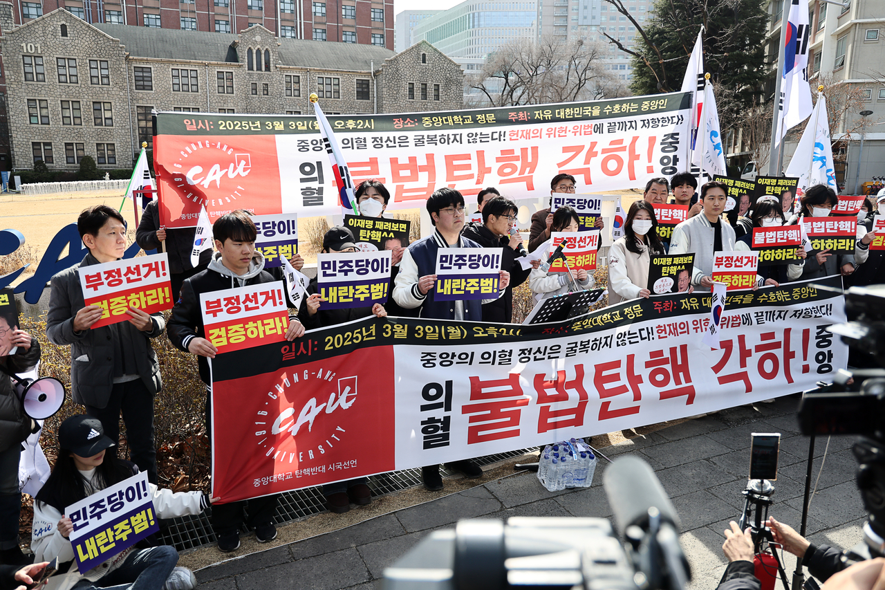 | 3일 서울 중앙대학교 정문에서 탄핵 반대 기자회견이 진행되고 있다. [연합] |
