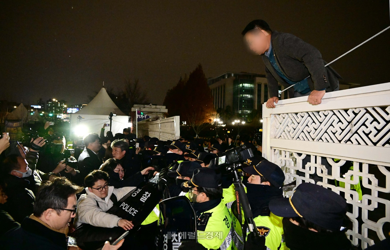| 12·3 비상계엄 선포 다음 날인 4일 새벽 국회 관계자들이 서울 영등포구 여의도 국회에 들어가고 있다. [이상섭 기자] |