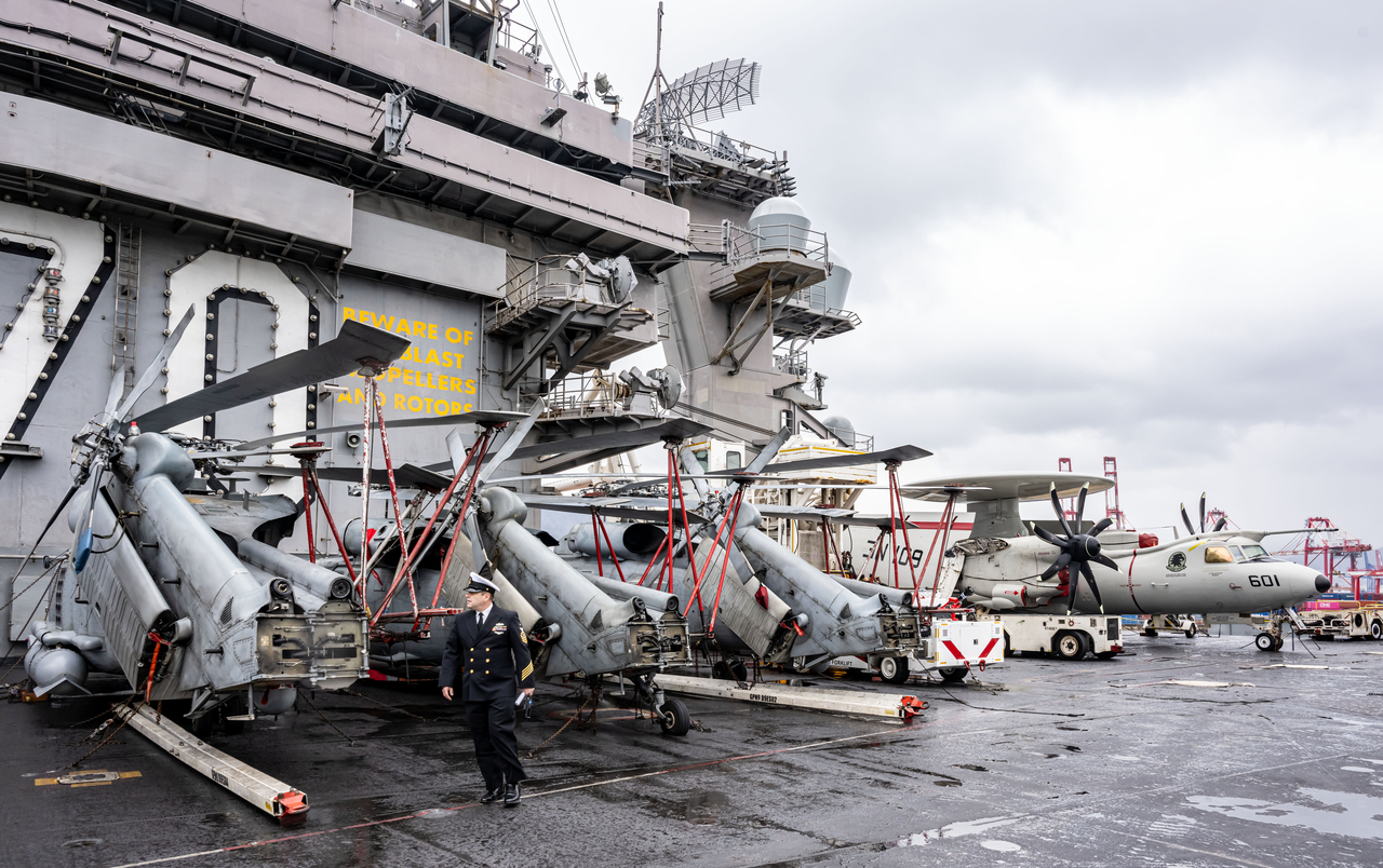 1982년에 취역한 칼빈슨함은 길이 333m, 폭 77m, 비행갑판 76.4m로 2기의 원자로로 운행하는 핵추진항모다.