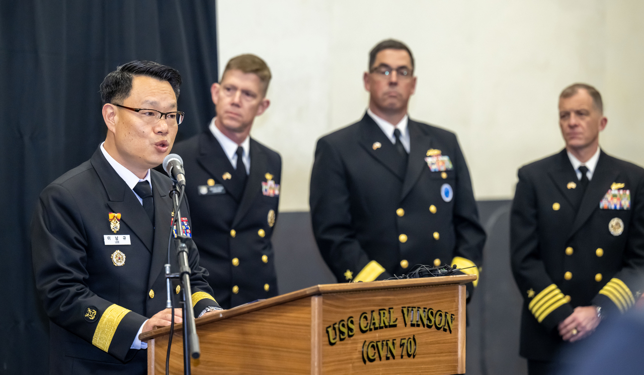 | 이남규(준장) 해군작전사령부 해양작전본부장이 3일 부산 작전기지에 입항한 미국 핵 추진 항공모함 ‘칼빈슨함’(CVN-70) 격납고에서 발언하고 있다. [연합] |
