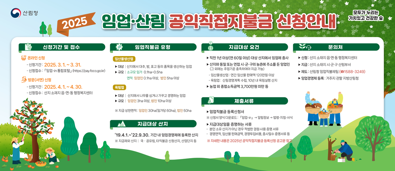 그 외 자세한 사항은 각 시군구 산림 부서와 읍·면·동 행정복지센터에서 확인할 수 있으며 산림청 임업직불금 상담센터(연중운영)에서도 궁금한 사항을 안내받을 수 있다.