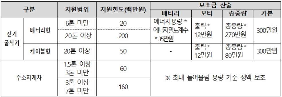 성능이 좋은 전기굴착기의 보급 유도를 위해 전기굴착기의 배터리 에너지용량, 모터 정격출력, 총중량에 따라 제품별 보조금 지원액을 차등화했다.