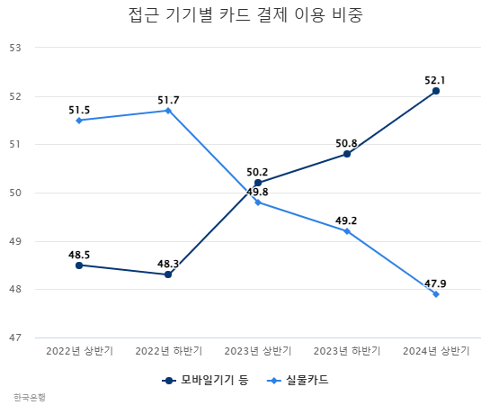 접근 기기별 결제 이용 비중만 봐도 2023년 상반기부터 모바일기기가 실물카드 이용을 앞질렀다. 지난해 상반기 모바일기기를 이용한 결제는 52.1%로 실물카드 결제(47.9%)와 격차가 더 벌어졌다.