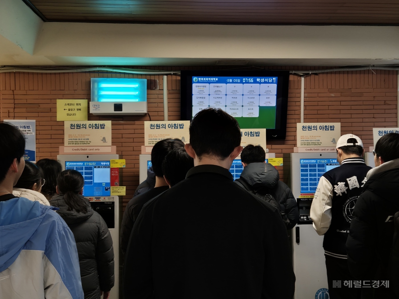 | 5일 오전 서울 동대문구 한국외국어대학교 학생식당에 1000원 아침밥을 먹기 위해 학생들이 줄을 서고 있다. 김도윤 기자. |