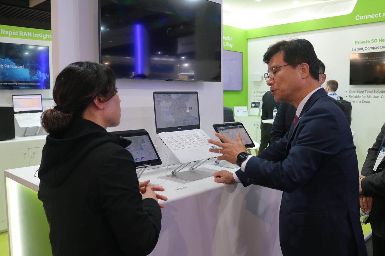 | 5일(현지 시간) 스페인 바르셀로나에서 열린 MWC25 내 전시관에서 김영식 NST 이사장이 시연 관련 질의하고 있다. [NST 제공] |