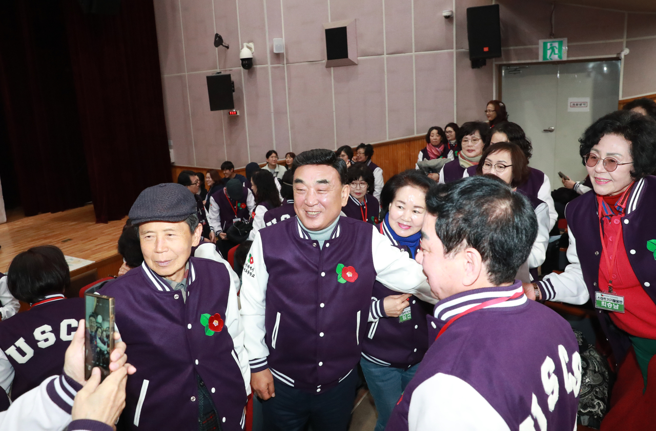 | 김두겸 울산시장이 5일 울산가족문화센터 대강당에서 열린 울산 시니어초등학교 제3기 신입생 입학식에서 입학생들과 정겹게 인사를 나누고 있다. [울산시 제공] |