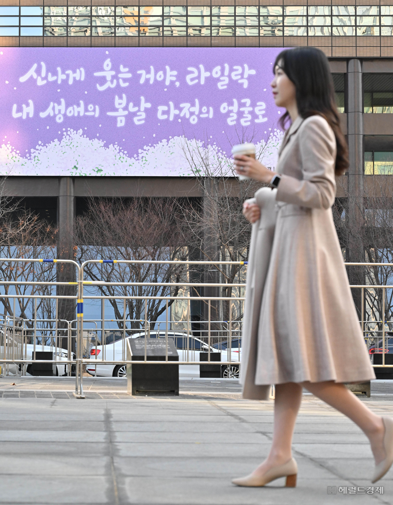 [헤럴드pic] 봄편으로 찾아온 광화문글판 글꼴 선택 본문 텍스트 크게본문 텍스트 작게 인쇄 [헤럴드경제=임세준 기자] 6일 오전 서울 종로구 교보생명빌딩 외벽에 허수경 시인의 시 ‘라일락’의 한 구절 “신나게 웃는 거야, 라일락 내 생애의 봄날 다정의 얼굴로” 제작된 광화문글판 봄편이 걸려있다. 교보생명은 이번 문안에 대해 기나긴 겨울을 보내고 봄이 되면 활짝 피어나 향기를 내뿜는 라일락처럼 지나간 일은 잊고, 더 나은 내일을 향해 나아가자는 메시지를 담았다고 밝혔다.