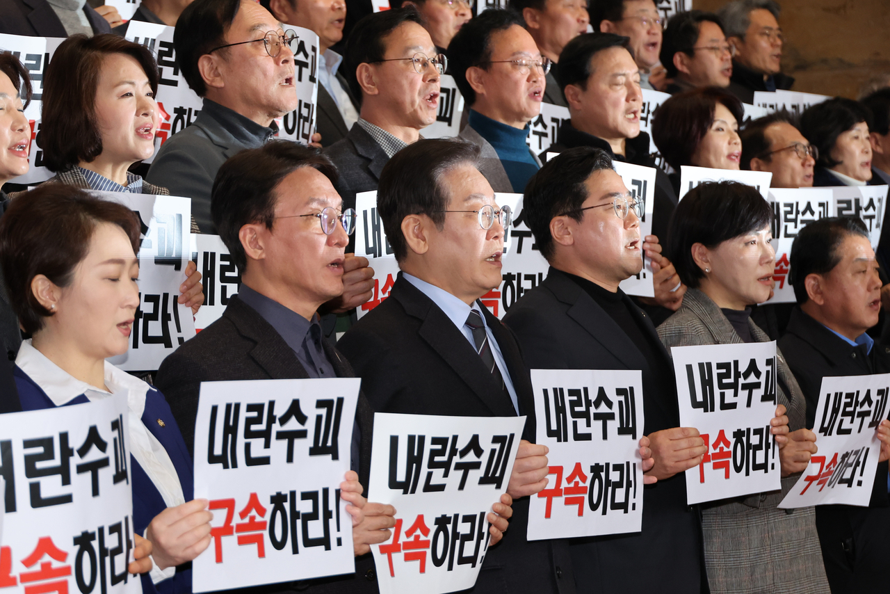 | 이재명 더불어민주당 대표와 박찬대 원내대표를 비롯한 의원들이 9일 서울 여의도 국회에서 비상 의원총회를 마치고 본청 계단에서 윤석열 대통령을 석방한 검찰을 규탄하는 구호를 외치고 있다. [연합] |