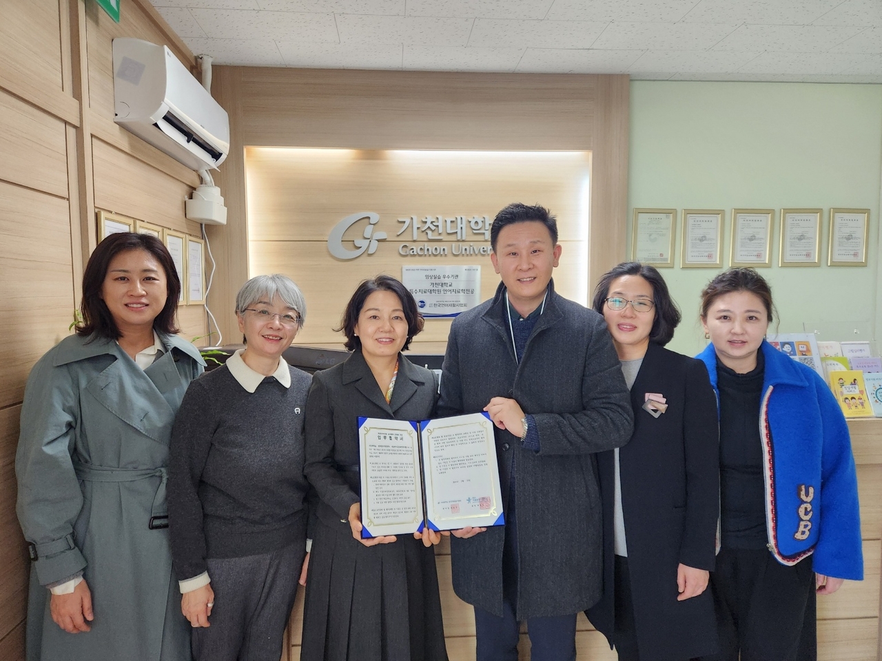 | 가천대통합발달심리센터와 성남시아동보호전문기관이 지난 10일 대학 특수치료대학원에서 성남시 학대피해아동 지원을 위한 업무협약을 체결하고 기념사진을 촬영하고 있다.[가천대 제공] |