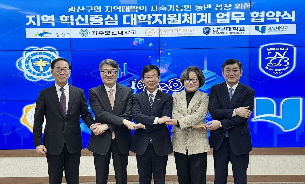 [헤럴드경제(광주)=서인주 기자] 호남대학교(총장 박상철)는 지난 10일 광산구청 2층 회의실에서 광산구청(구청장 박병규), 광주보건대학교(총장 김경태), 광주여자대학교(총장 김선재), 남부대학교(총장 조준범)와 지역혁신중심 대학지원체계(RISE) 사업 성공을 위해 상호 협력을 위한 업무협약을 체결했다.