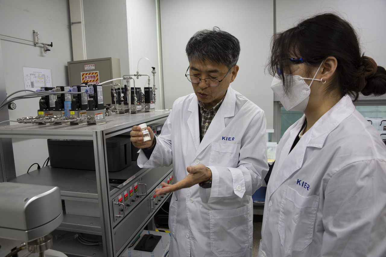 | 한국에너지기술연구원 연구진이 사진자료 연구진이 개발한 흡수제의 성능을 확인하고 있다.[한국에너지기술연구원 제공] |