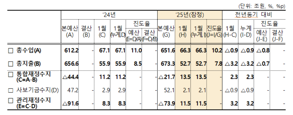 국세 수입이 지난해 1월보다 7000억원 증가했지만 기금·세외 수입이 모두 줄면서 총수입은 작년보다 9000억원 감소한 66조3000억원으로 집계됐다. 진도율은 10.2%로 0.8%포인트 떨어졌다.