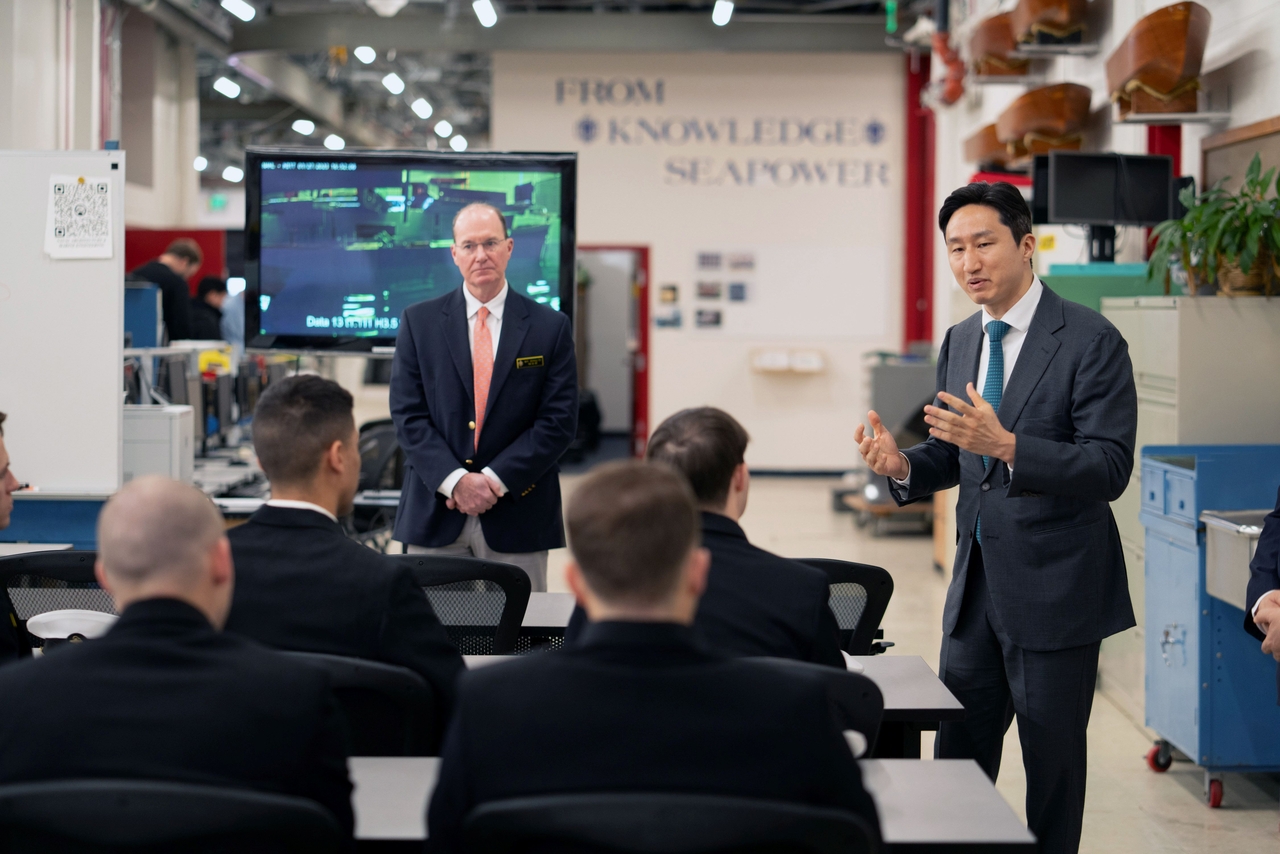 | 정기선 (오른쪽) HD현대 수석부회장 대표이사가 주력사업 성장을 위해 연초부터 광폭 행보를 이어가고 있다. 7일(현지시간) 미국 해군사관학교를 방문해 생도들과 만남을 가진 정 수석부회장 [HD현대 제공] |