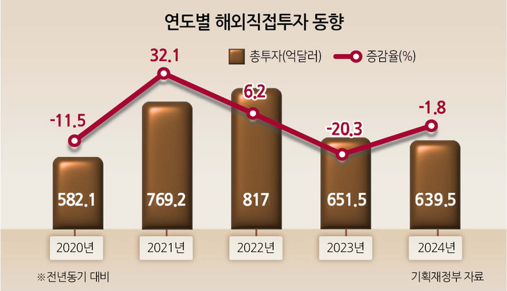 해외직접투자액은 2020년 감소(-11.5%)한 뒤 2021년 32.1%, 2022년 6.2% 늘었다. 하지만 2023년 20.3% 감소로 돌아섰다. 지난해에는 1분기부터 3분기까지 연속(7.0%→0.7%→ 5.0%)으로 감소세를 보이다가 4분기 5.6% 반짝 반등했지만 연간 추세를 바꾸진 못했다.