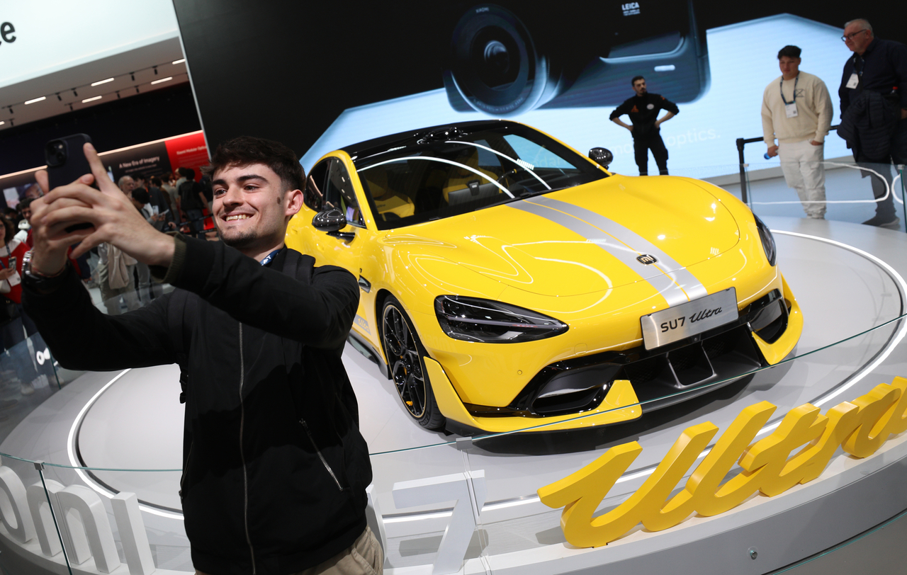 | 한 남성이 샤오미 SU7 울트라를 배경으로 사진을 찍고 있다. [신화] |