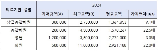 이렇다 보니 발생하는 수술비도 천차만별이다. 예컨대 종합병원에서의 전립선 수술은 최저 20만원에 이뤄지지만, 개인 의원에서는 최고 1100만원까지 뛴다. 같은 수술이지만 55배에 달하는 비용 차이가 발생하는 것이다. 더욱이 비급여 도구 이용 개수에 따라 재료비 차이도 발생한다. 같은 의원에서도 50만원에서 600만원까지 최대 12배까지 벌어진다는 점에서 소비자가 체감하는 가격 부담은 더욱 확대될 수 있다.