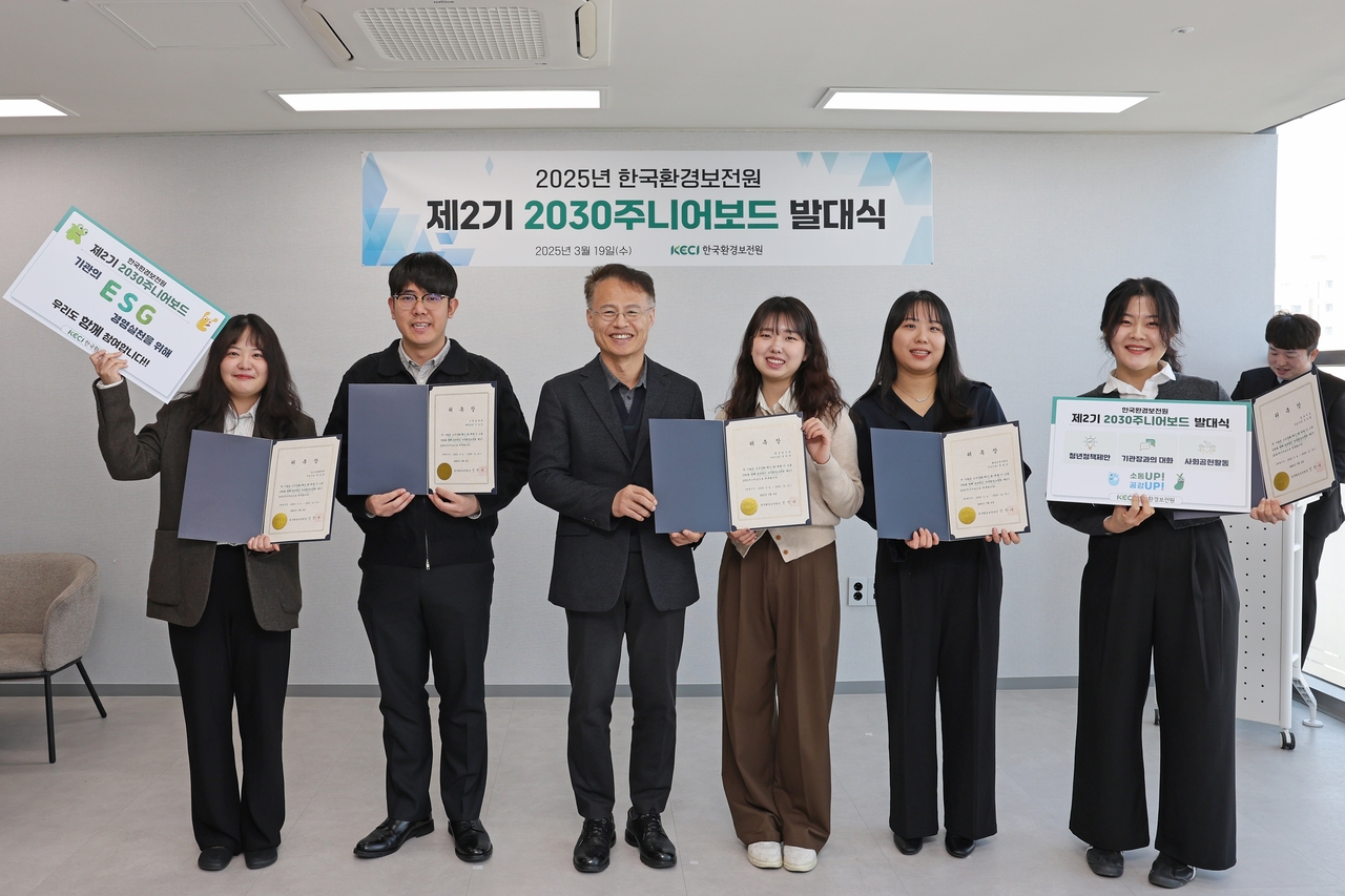 | 신진수 한국환경보전원 원장(사진 왼쪽에서 세 번째)이 19일 ‘제2기 2030주니어보드 발대식’에서 주니어보드 5인과 기념촬영을 하고 있다.[한국환경보전원 제공] |