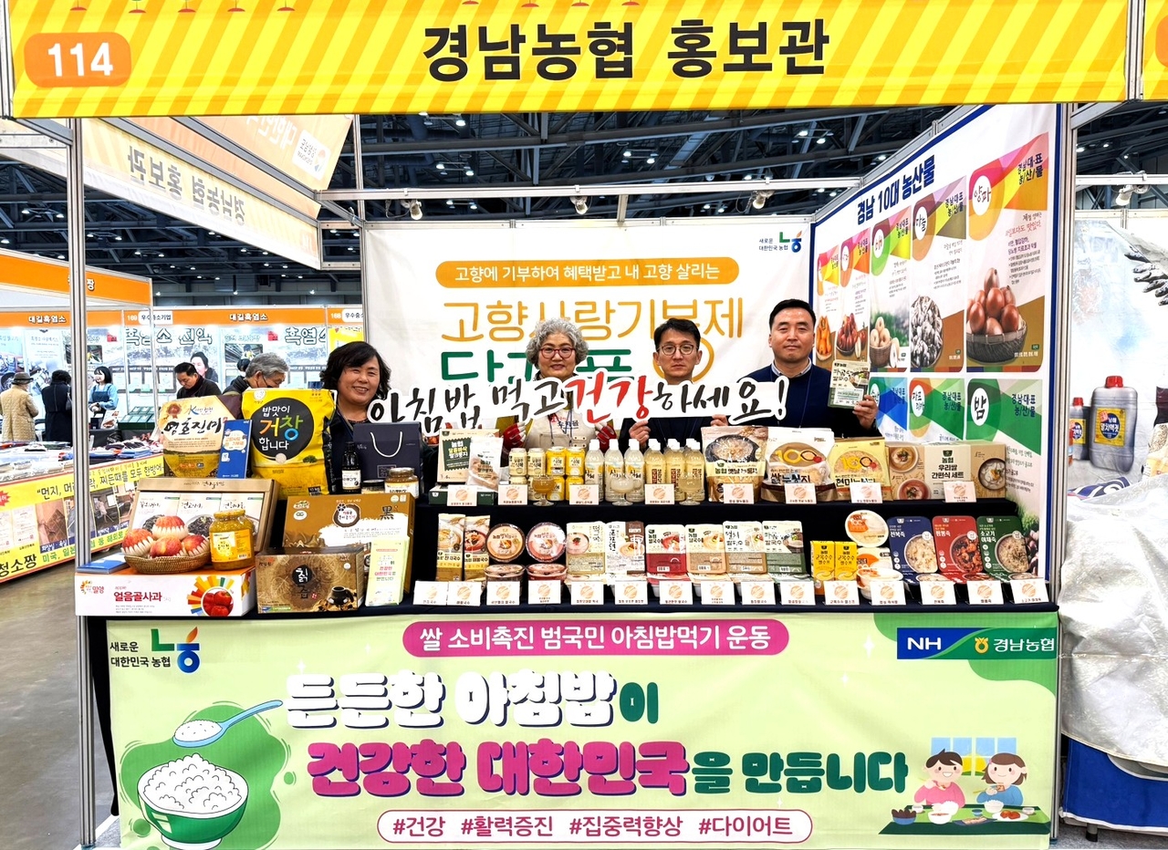 [헤럴드경제(창원)=황상욱 기자] 경남농협(본부장 류길년)은 20일부터 23일까지 4일간 부산 벡스코에서 개최되는 ‘제11회 대한민국 대표 특산물 직거래 박람회’에 홍보관을 설치해 운영한다고 21일 밝혔다. 이 홍보관은 주요 농산물 판매와 아침밥 먹기, 고향사랑기부제 활성화 등을 홍보한다.