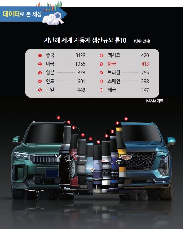 한국자동차모빌리티산업협회(KAMA) 보고서에 따르면, 중국, 미국, 일본, 인도가 4년 연속 상위 4개국 자리를 유지했다. 이들 4개국의 생산은 글로벌 전체 자동차 생산의 59.7%를 차지했다. 이어 5위는 독일이었고, 6위는 멕시코로 집계됐다. 한국은 7위를 차지했다. 한국은 전년 대비 2.7% 감소한 413만대의 자동차를 생산했다. 지난해 한국의 내수 판매는 163만대에 불과, 2013년 이후 최저치를 기록했다. 내수 부진 여파로 한국이 글로벌 6위 자리를 멕시코에 내준 것으로 분석됐다. 다음으로 8~10위는 각각 브라질, 스페인, 태국 등으로 조사됐다.