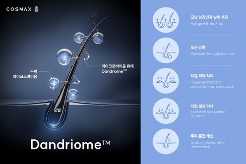 코스맥스는 모낭 주변 미생물군을 채취해 댄드리옴(Dandriome)을 수립했다. 소재명은 비듬(dandruff)과 마이크로바이옴(microbiome)에서 따왔다.