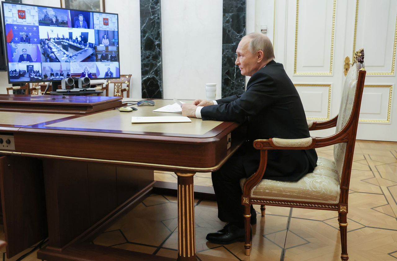 | 블라디미르 푸틴 러시아 대통령이 25일(현지시간) 모스크바 크렘린궁에서 화상 회의에 참여하고 있다. [EPA] |