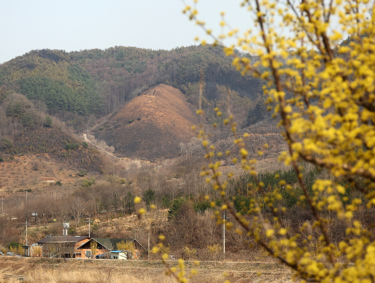 | 경남 산청군에서 발생한 산불 사흘째인 23일 경남 산청군 시천천 인근 산책로에 활짝 핀 산수유 뒤로 검게 탄 야산이 보인다. <연합뉴스> |
