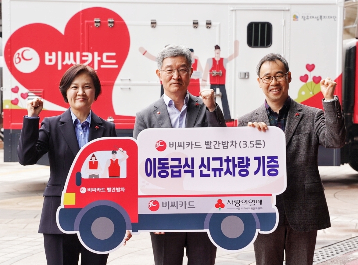 | 27일 서울 중구 ‘사랑의열매회관’ 앞에서 열린 빨간밥차 기증식. 사진 최원석(가운데) BC카드 사장, 신혜영(왼쪽) 서울사랑의열매 사무처장, 김성호(오른쪽) 장유대성복지재단 상임이사. [BC카드] |