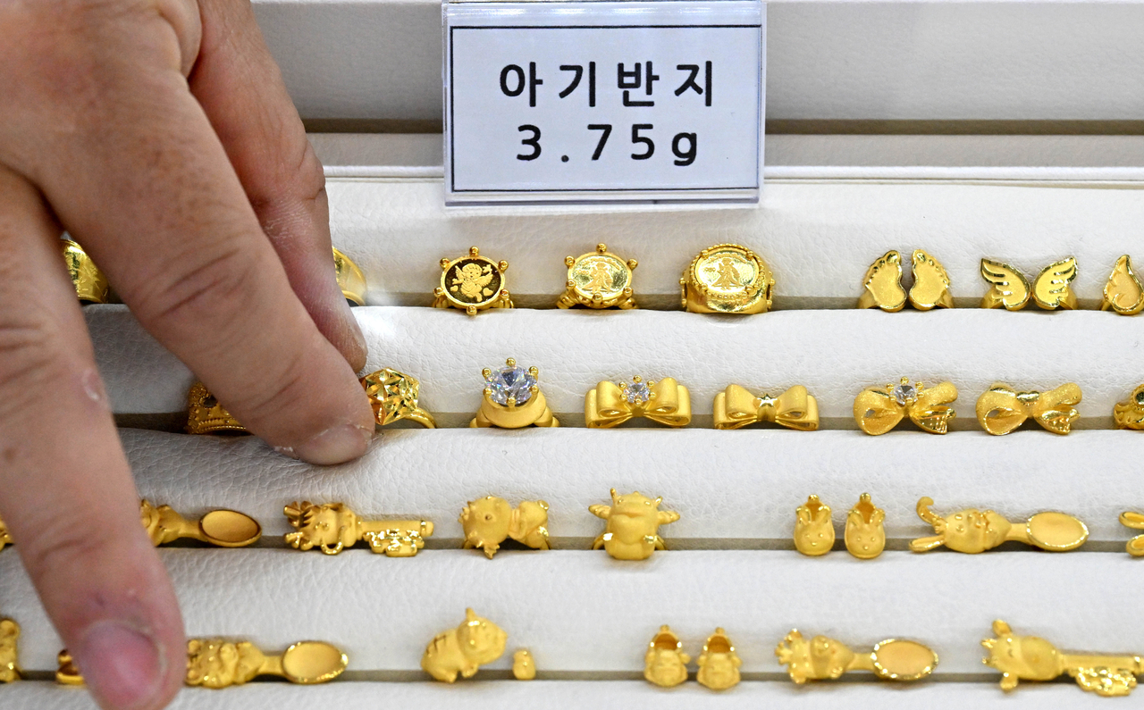 | 안전자산 수요가 급증하며 금 가격이 연일 사상 최고치를 경신하는 가운데 돌반지 (3.75g) 개당 가격이 60만 원을 앞두고 있다. 서울 종로구 한국금거래소에서 직원이 돌반지를 진열하고 있다. [임세준 기자] |